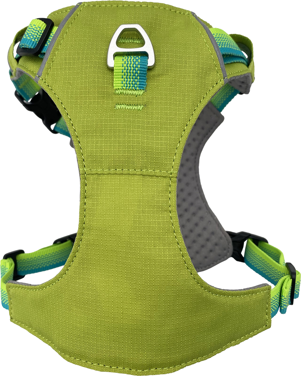 Both lead attachment points — front chest and back — use aluminium D-rings. Aluminium is corrosion-resistant, lighter than steel, and built to handle the repeated load of an active dog without wearing down over time.